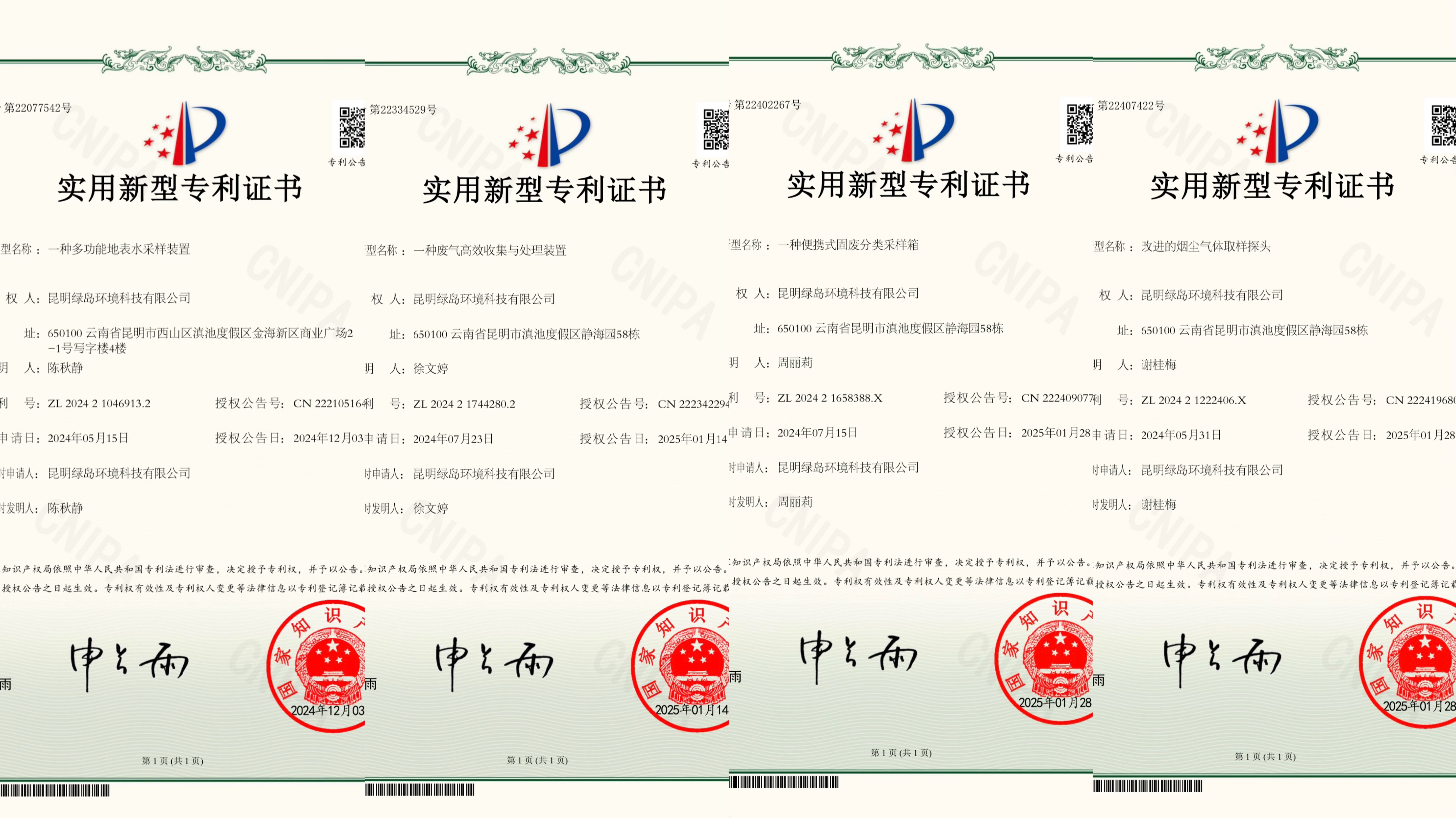 昆明綠島環(huán)境科技有限公司四項專利申請喜獲國家知識產(chǎn)權局授權