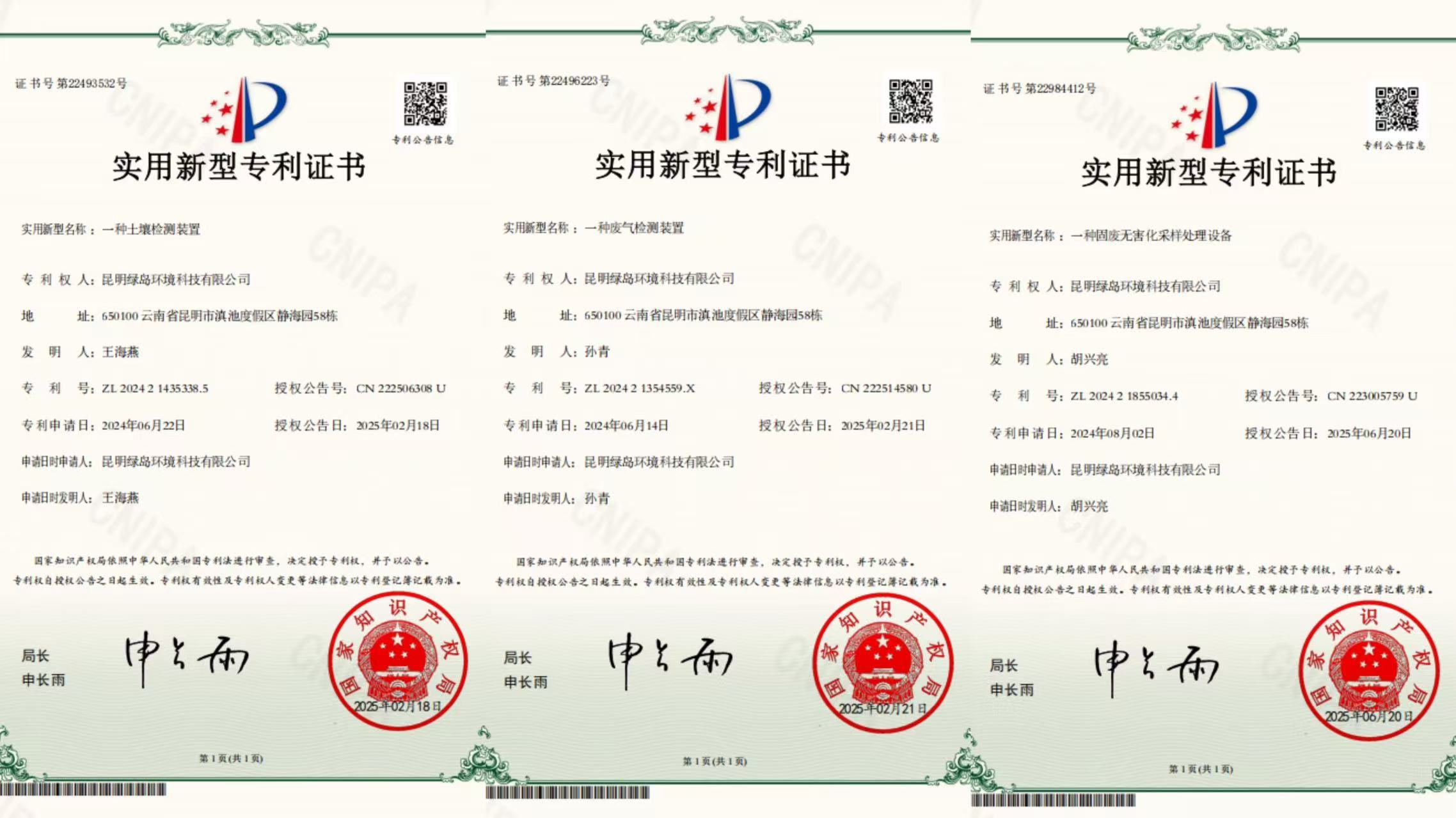 昆明綠島環(huán)境科技有限公司三項專利申請喜獲國家知識產(chǎn)權局授權